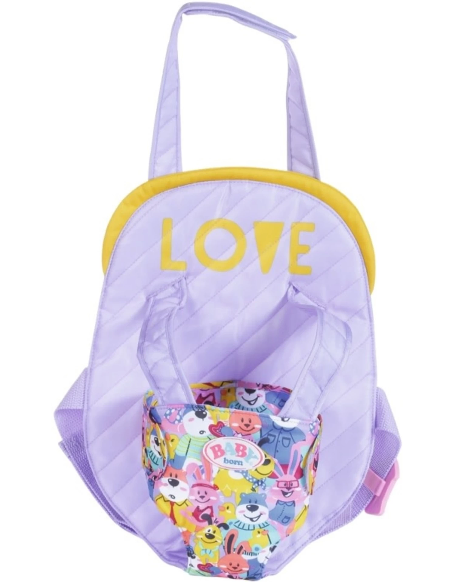 BABY Born is dol op een wandeling door het park. Er valt ook altijd zoveel te ontdekken. Er huppelen konijntjes door het gras, zwemmen eendjes op de vijver en er rennen honden langs. Net als de dierenvriendjes op haar draagzak. Het enige dat nog ontbreekt, zijn de beren. Maar er zijn wel bessen: bramen, frambozen en bosbessen. BABY Born reist heel graag in haar paarse draagzak, zodat ze zelf de zoete vruchten kan plukken en alles kan zien wat er om haar heen gebeurt. De riempjes kunnen versteld worden, afhankelijk van de grootte van het kind.