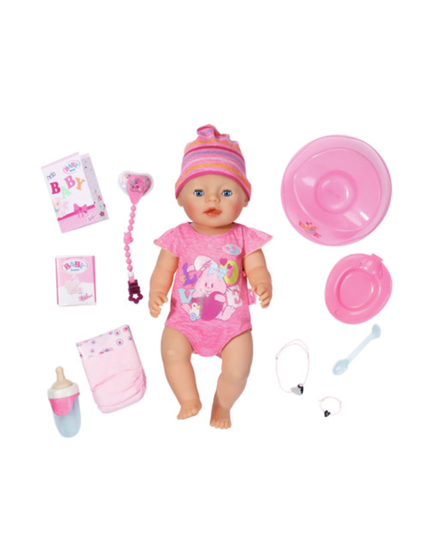 Haar negen functies, waar geen batterijen voor nodig zijn, maken het moeder/kind-rollenspel nog spannender en levensechter. Ze kan uit haar flesje drinken en haar BABY born®-pap met een lepel eten van haar bord. Wat erin gaat, moet er natuurlijk ook weer uit, dus ze kan in haar luier plassen en op het potje gaan.