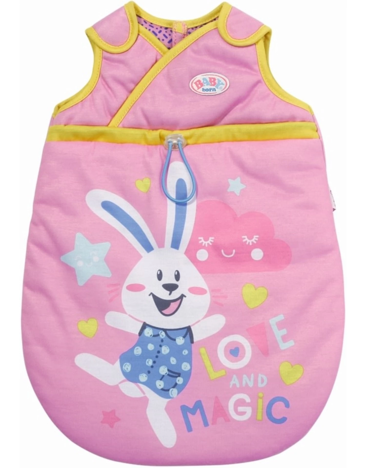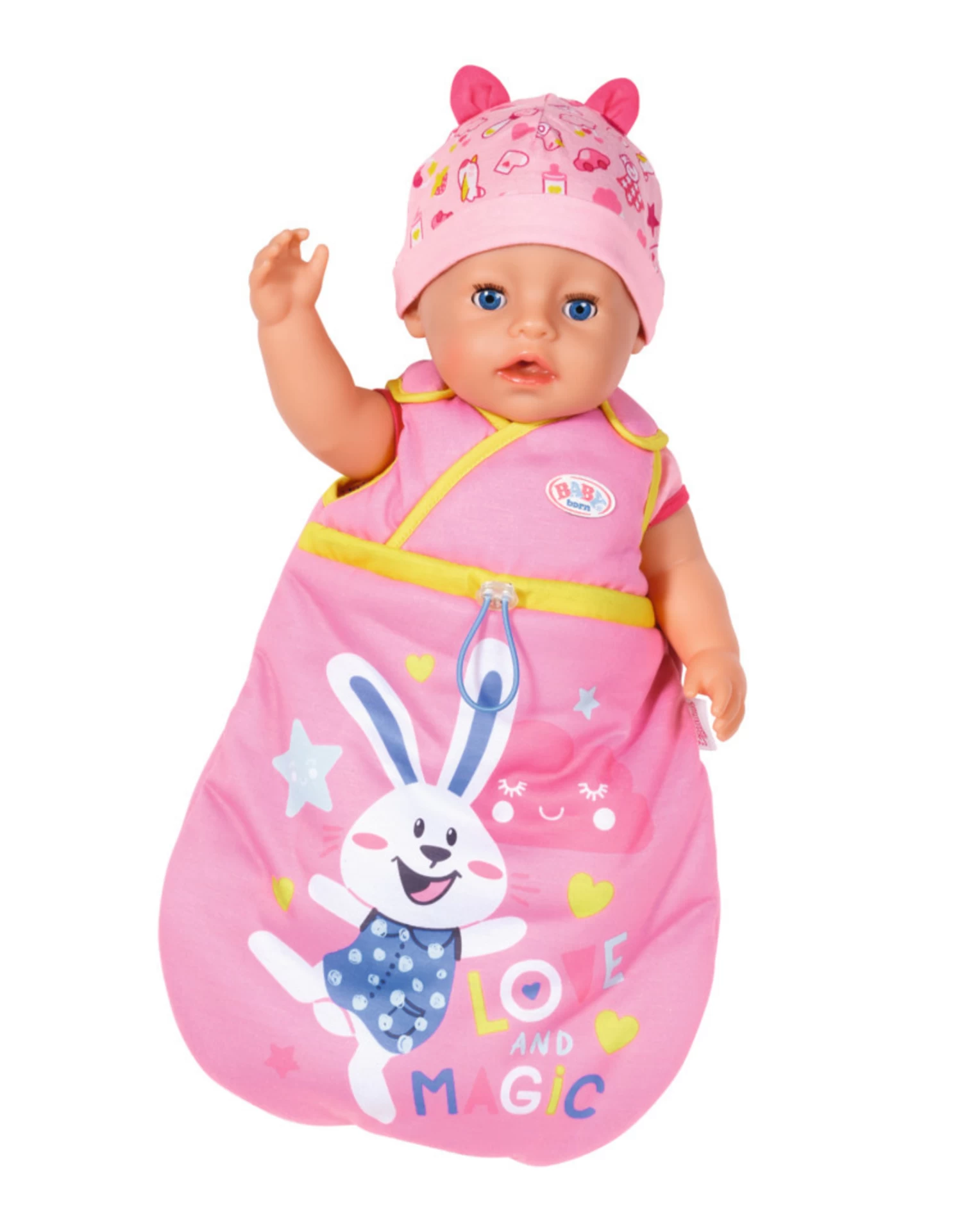 Slapen is een van de favoriete activiteiten van BABY born. Iedereen die zo van verkennen houdt en zo graag nieuwe dingen leert als zij heeft tijd nodig om alles te verwerken. De kleine meid ligt heerlijk comfortabel in haar knusse, roze slaapzak. Door het klittenband op de schouders kan ze er makkelijk inglijden. Benno het konijn staat op de slaapzak en vindt het supergezellig dat BABY born bij hem komt liggen om samen te dromen.