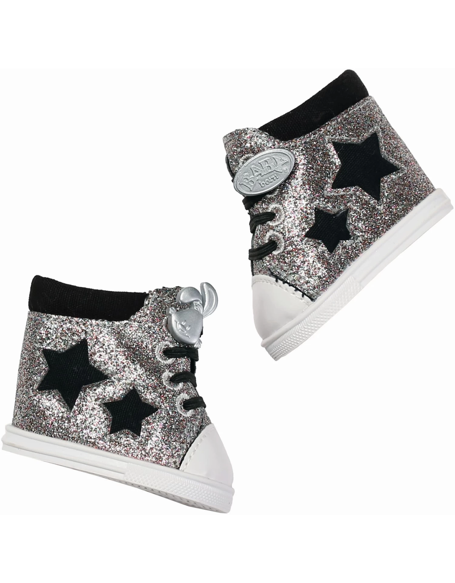 “Glitters zijn een must-have en de nieuwste trend!” BABY born’s broer maakt vaak grapjes over haar en haar zus wanneer ze iets dragen wat hij ‘glitter-flitter’ noemt. Maar soms trekt hij zelfs ook stiekem die sprankelende sneakers aan. Ze zien er wel heel cool uit. De enkelhoge schoenen sprankelen in zilver en de platte sneakers in goud. Beide modellen hebben een zwarte voering, zwarte veters en schattige zwarte sterren aan de zijkant. De kleine modepopjes moeten zeker wat glitters in hun kledingkast hebben hangen.