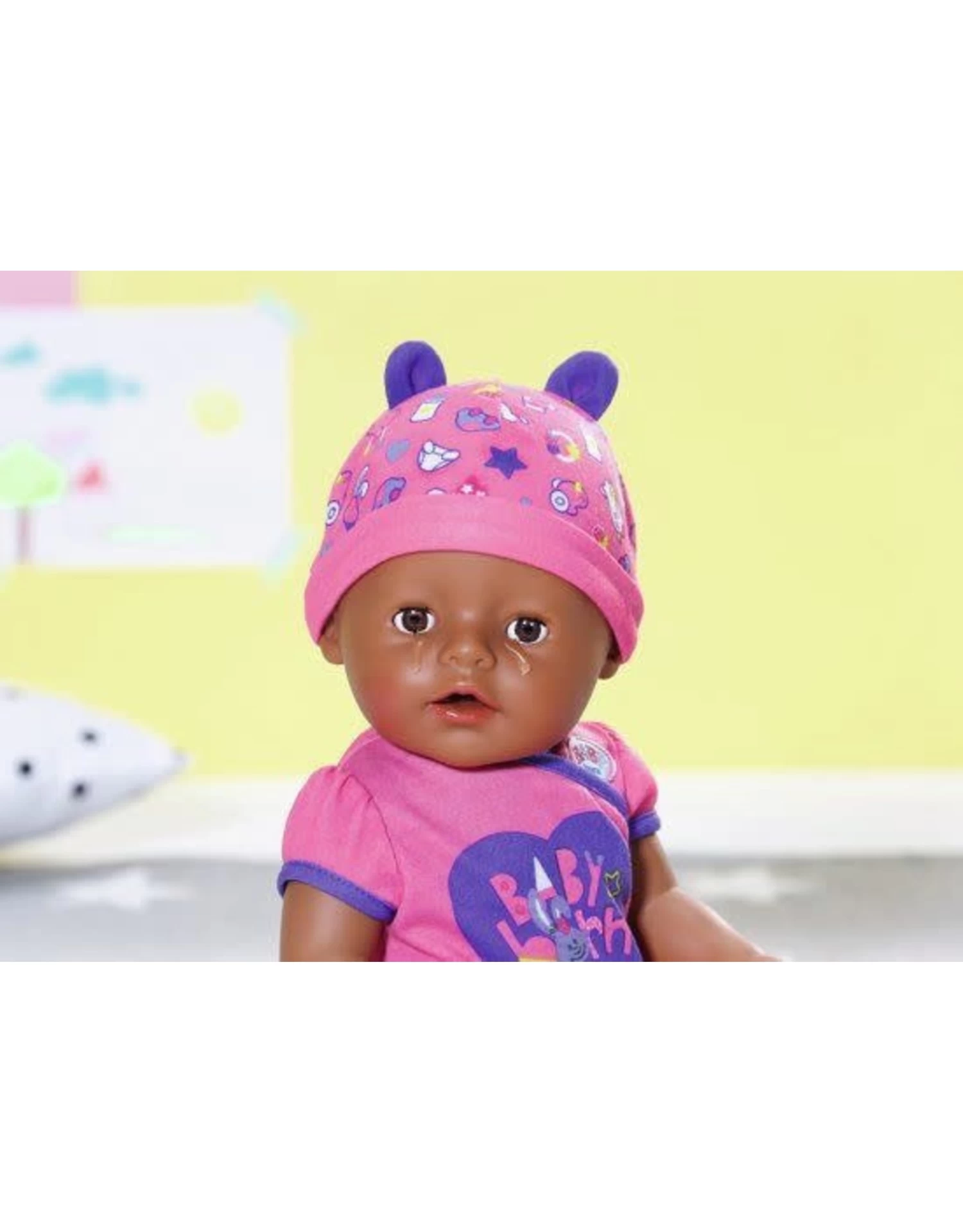 Hallo BABY born®, je bent ineens zo zacht. Dat is ze echt. Voor de eerste keer in haar geschiedenis voelt BABY born® nu ineens veel zachter aan – perfect om mee te knuffelen. Haar lijfje is zachter en soepeler geworden, zodat de levensechte functies (die allemaal werken zonder batterijen) nog makkelijker zijn om mee te spelen. BABY born®’s armpjes zijn nu nog beweeglijker, waardoor het aan- en uittrekken van haar kleurrijke kleding kinderspel is. BABY born® eet dolgraag haar babyhapje van haar bordje met een lepel, en haar favoriete drankje is water uit haar flesje. Als ze verdrietig is, huilt ze echte poppentranen wanneer je haar zachte bovenlijfje indrukt. Misschien huilt ze omdat ze naar de wc moet? Als je op de nieuwe zachte buikknop drukt, doet het poppetje een plasje. Ze doet zelfs een grote boodschap met de druk op een knop. Het kleine waterratje spettert en spattert dolgraag rond in het bad. Zodra ze zichzelf moe heeft gemaakt, sluit ze haar bruine ogen om te gaan slapen als je haar op haar rug legt – het is helemaal leuk als ze ook nog haar duim in haar mond heeft natuurlijk. De set basisartikelen omvat een roze bodysuit en een mutsje met schattige oortjes.
