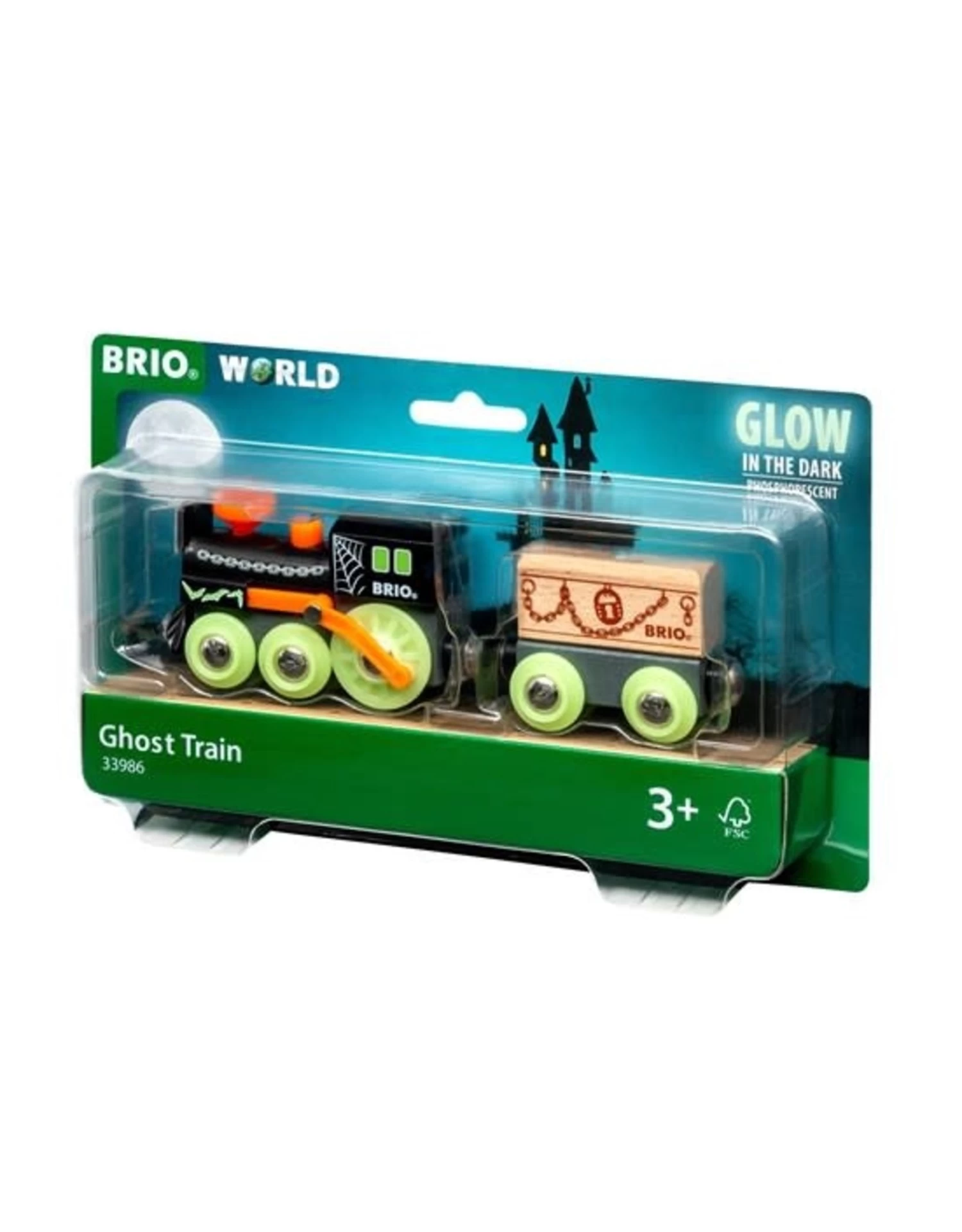 oeOEoe. Er kruipt iets engs langs de treinrails. De 33986 Ghost Train heeft glow-in-the-dark-details en sleept een houten kist mee – maar wat kan er nou in zitten? Deze geestachtige stoomtrein beschikt over de iconische magnetische aansluitingen van BRIO en kan aangesloten worden op andere voertuigen en wagons van de BRIO World-treinset om meteen aan de slag te gaan.