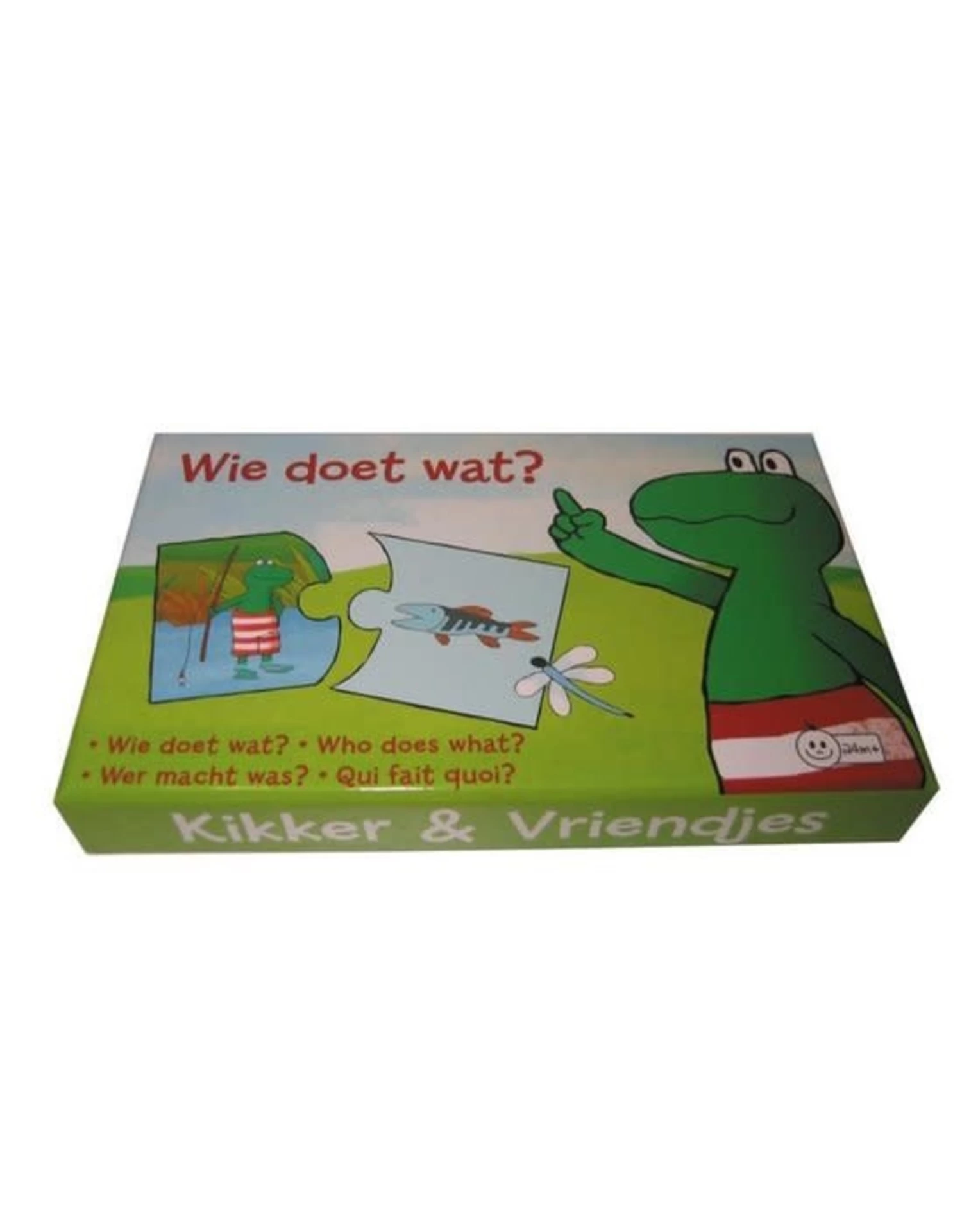 Wie doet wat in de wereld van Kikker en zijn vriendjes? Dit leuke spelletje is zeer geschikt voor kinderen vanaf een jaar of twee. Twee puzzelstukken, met op de één een personage dat wat doet en op de andere een voorwerp dat daarbij nodig is, moeten steeds worden gecombineerd. Kikker voor een schildersezel hoort bij de kwast, Varken voor zijn oven bij de taart. Dit spel stimuleert zowel de fijne motoriek als het combinatievermogen van jonge kinderen.