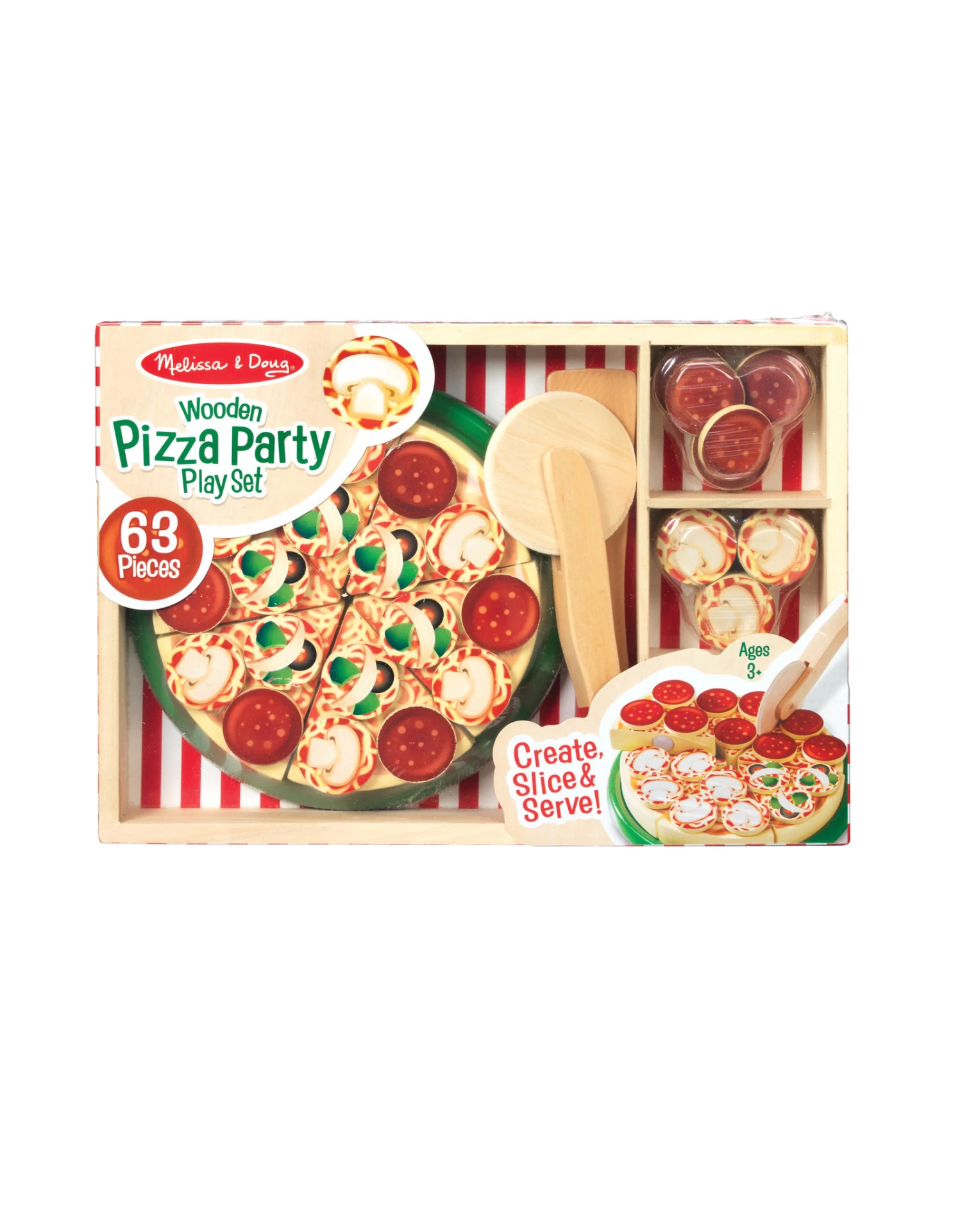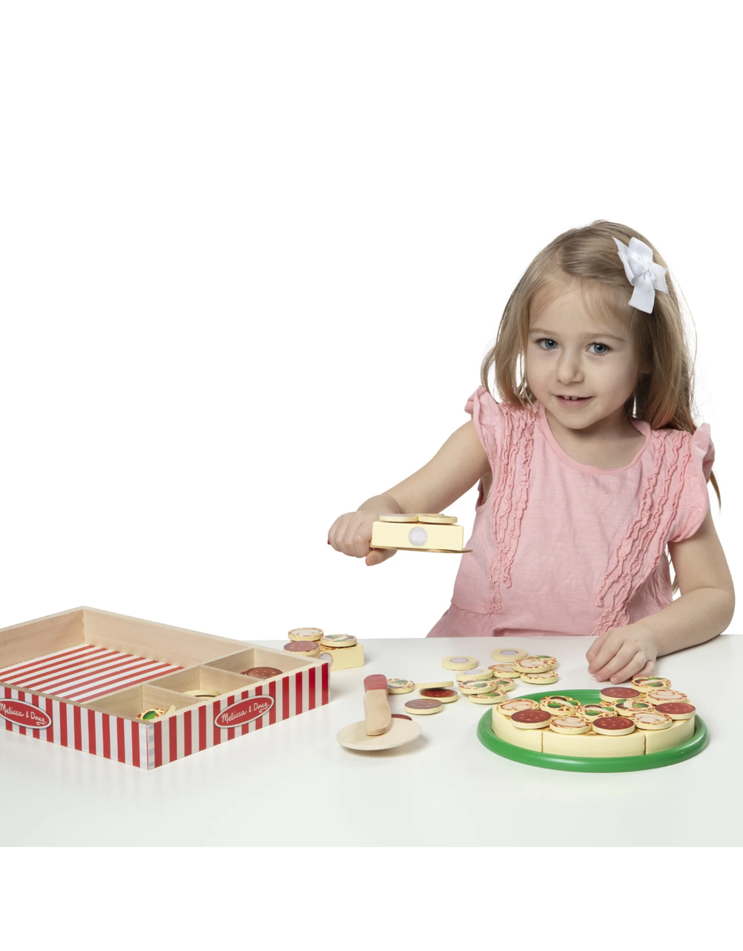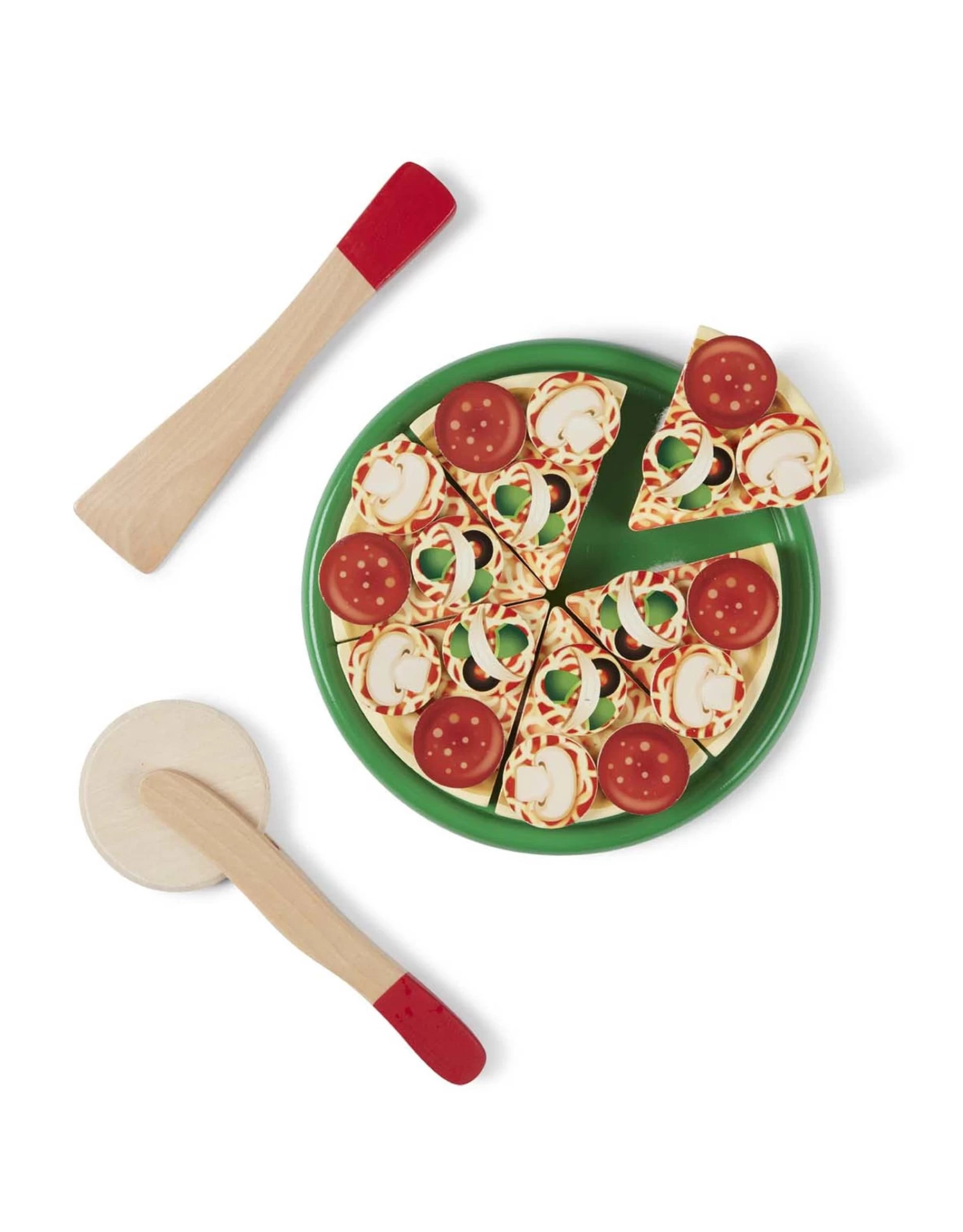 Maak je eigen persoonlijke pizza met deze stevige houten pizzaset. Zes snijdbare stukken geserveerd op een felgekleurd blad samen met een pizzasnijder, een spatel en meer dan 50 ingrediënten die netjes kunnen worden opgeborgen in een houten doos. Pizza maakt snijdgeluiden als deze wordt gesneden!