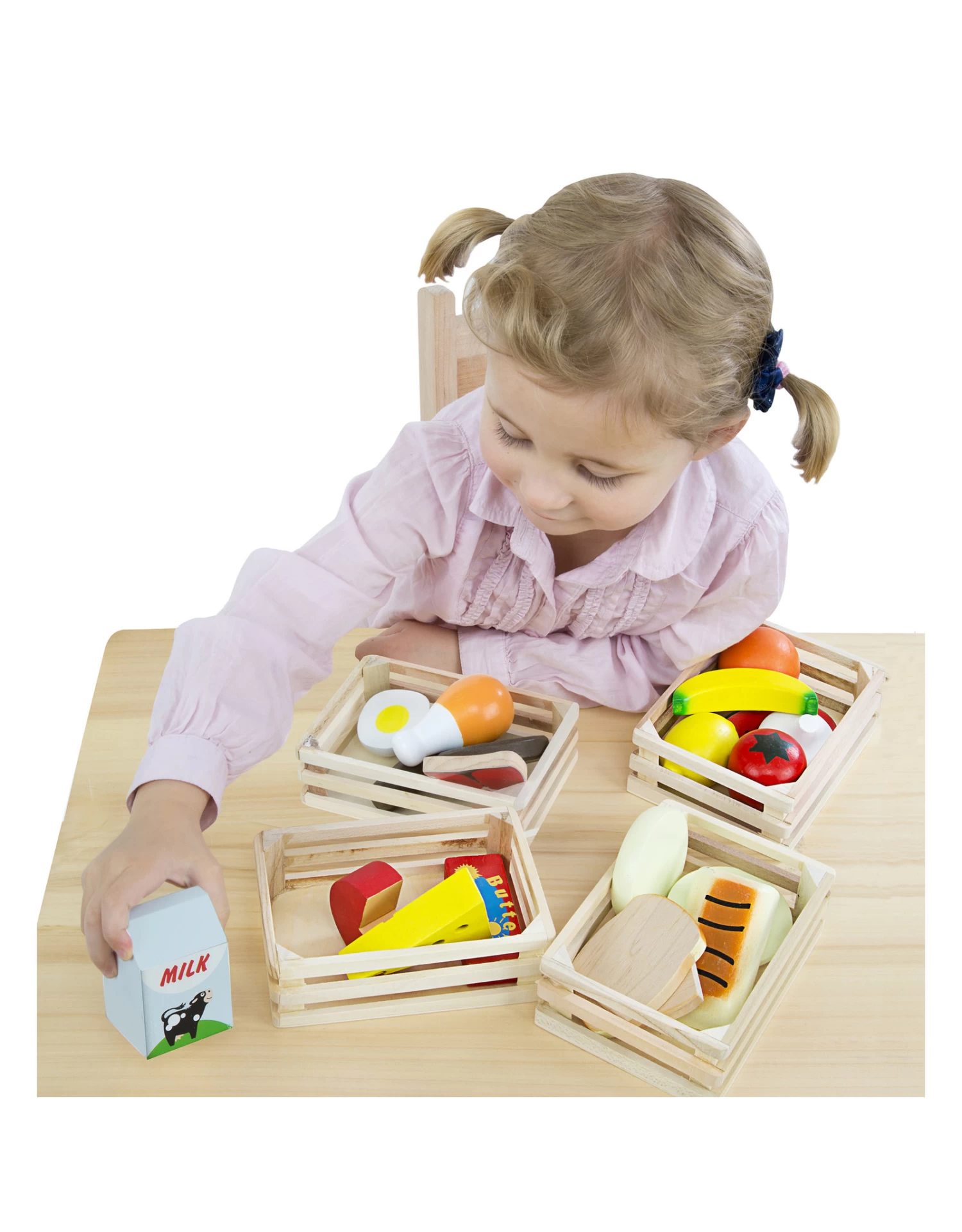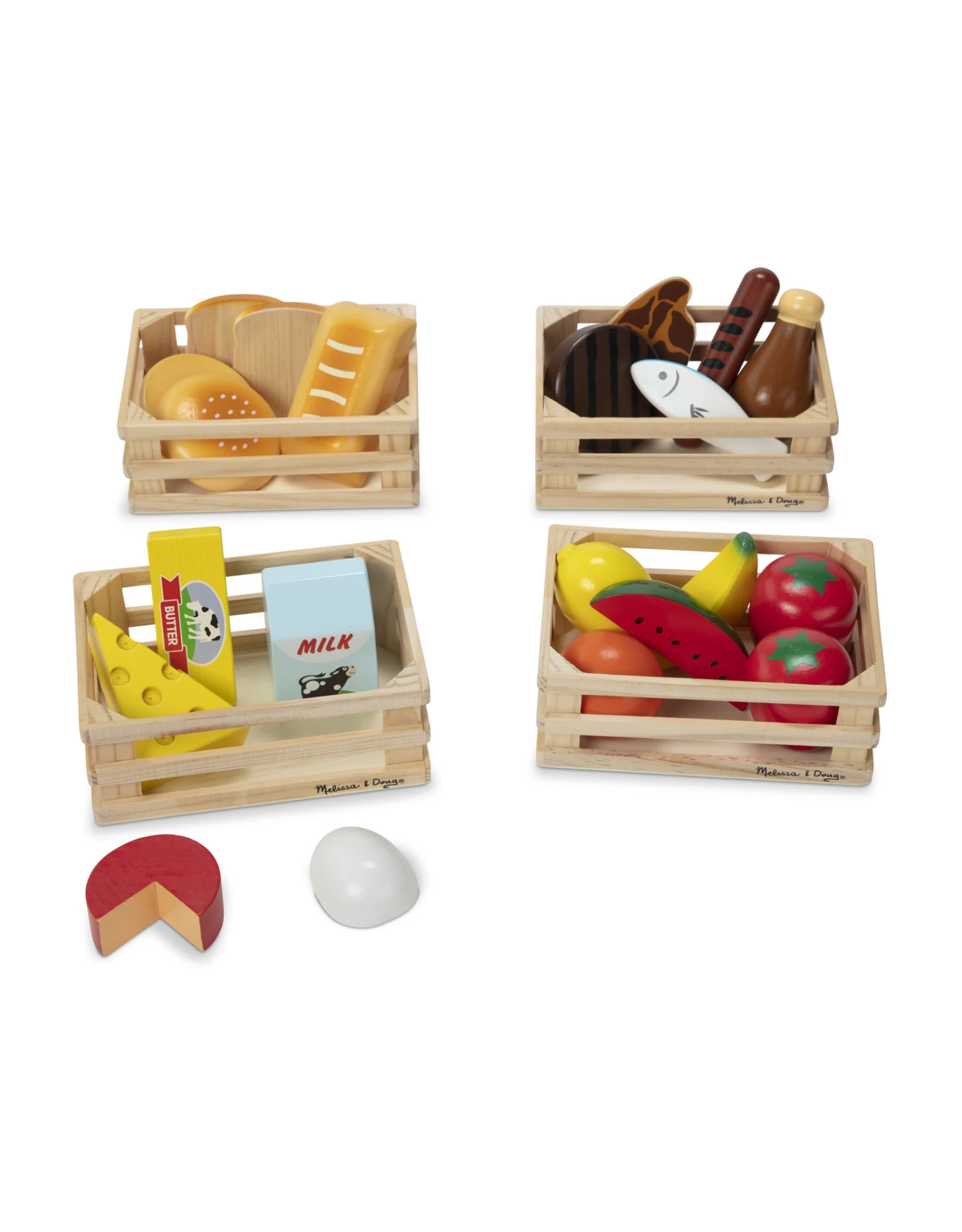 Om een uitgebalanceerd dieet te plannen vind je alles wat je nodig hebt in deze houten voedselset. De set bestaat uit verschillende voedingsmiddelen van zuivel, groente en fruit tot brood. Om alles netjes op te bergen wordt de set geleverd met 4 kratten.