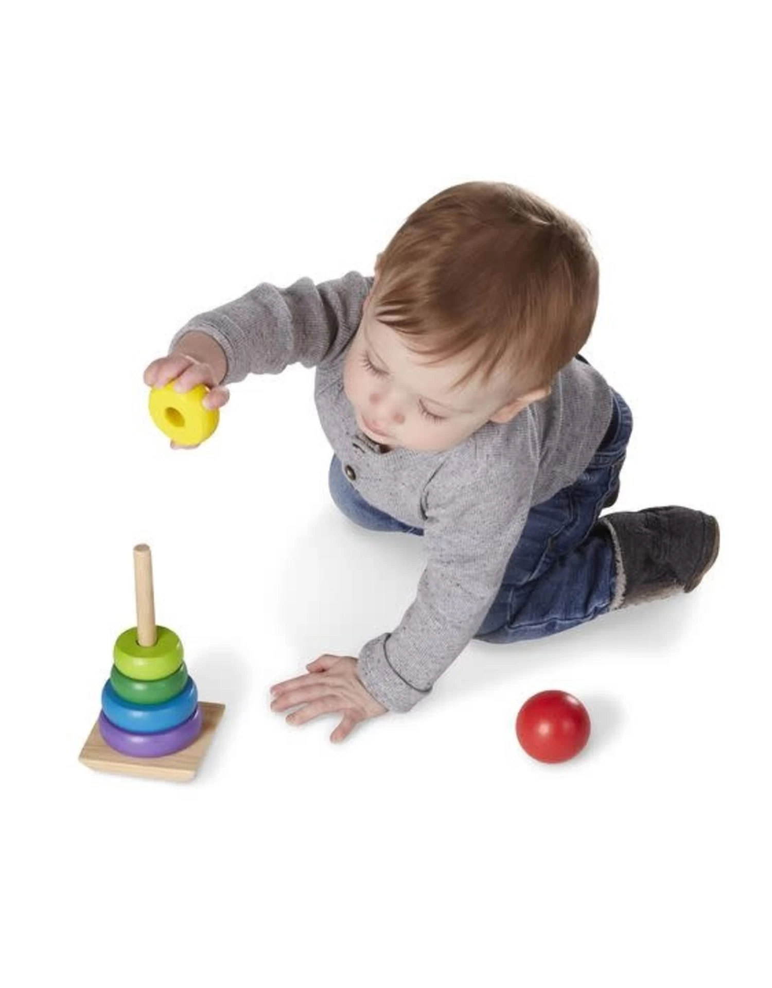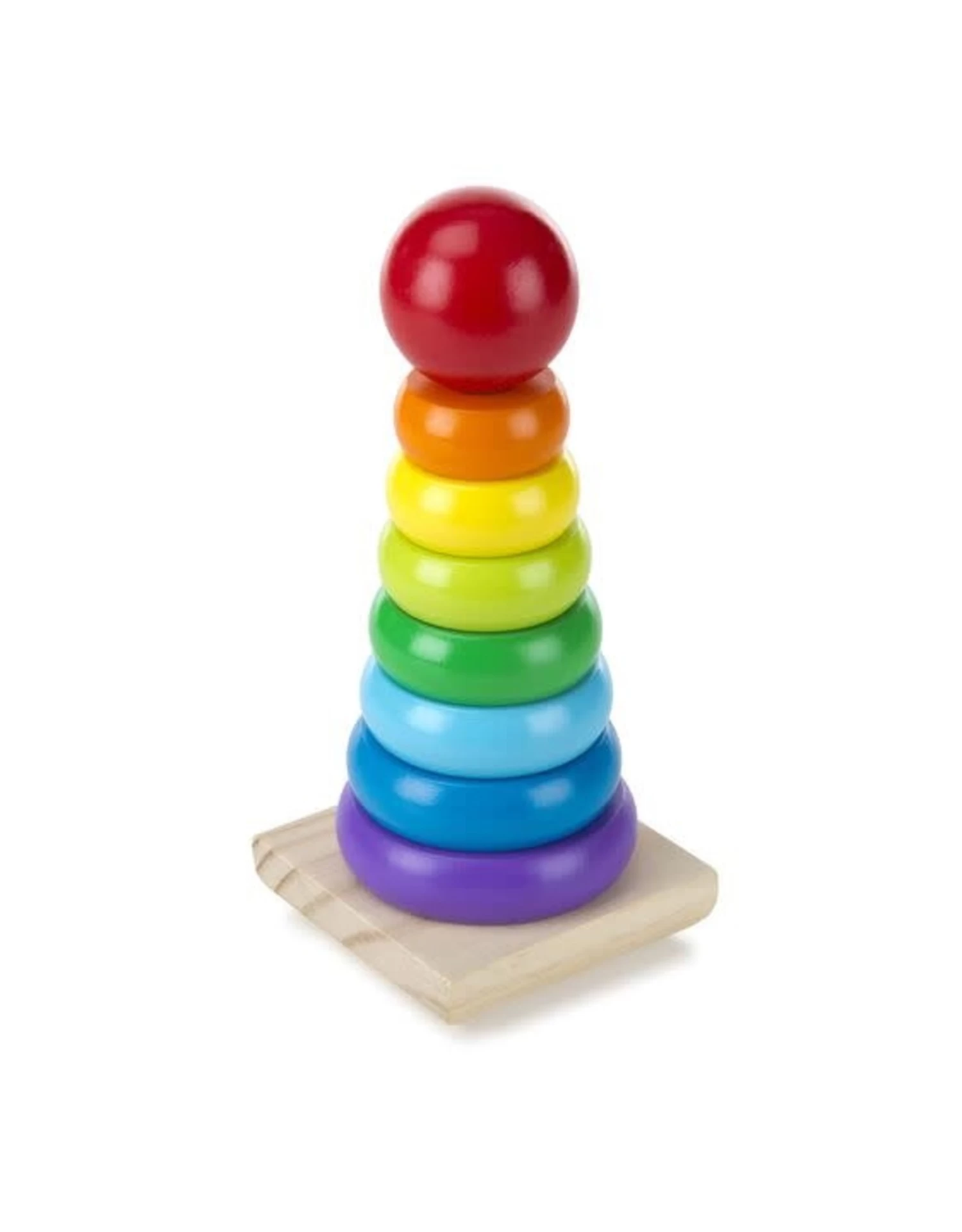 Op zoek naar klassiek kinderspeelgoed! Alle kleuren van de regenboog worden vertegenwoordigd in deze houten stapelaar. Sorteer de acht ronde, houten onderdelen en bouw je eigen regenboog!