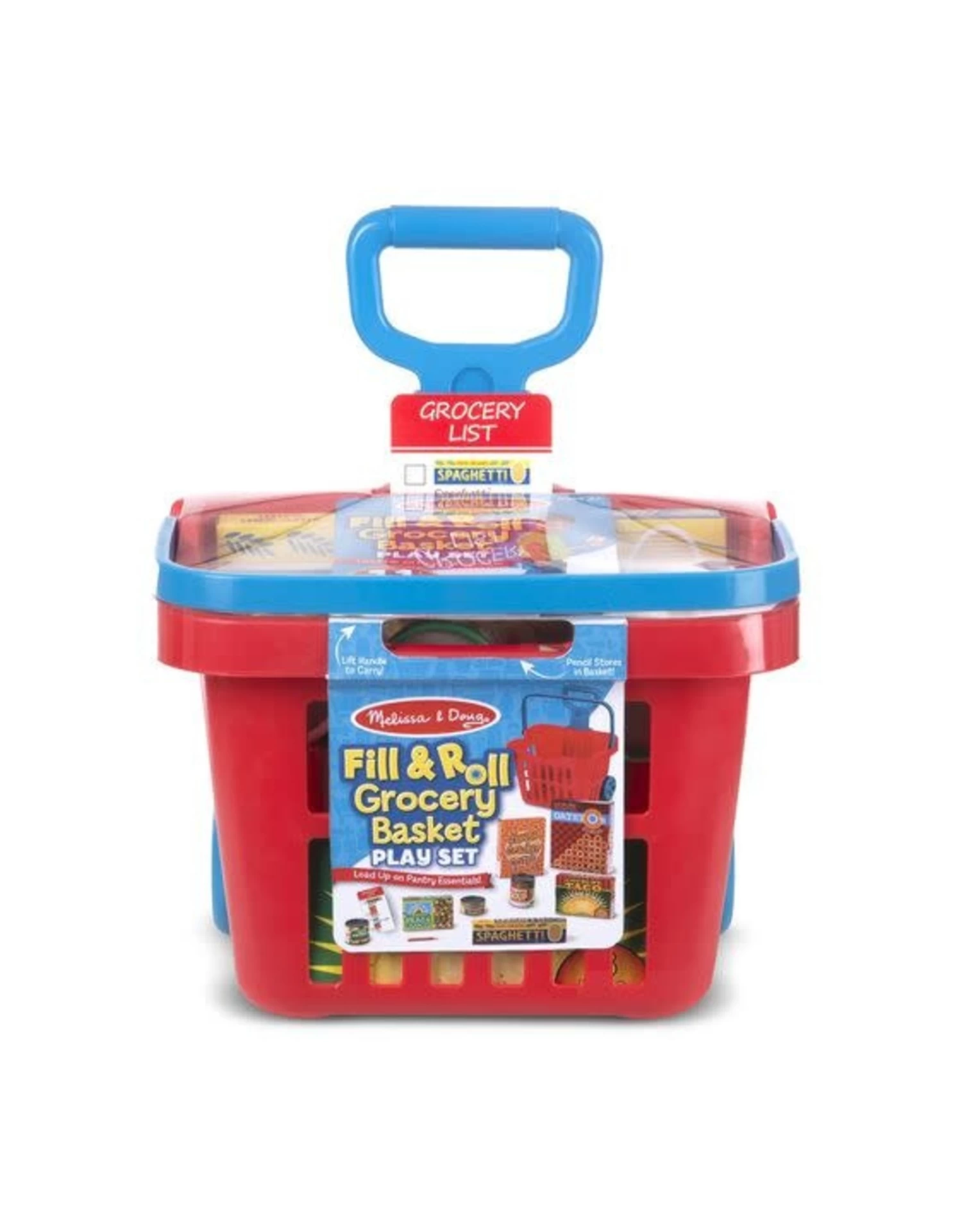 Geniet van het boodschappen doen met deze leuke boodschappenmand op wielen. Leg je boodschappen in de mand en trek het handvat uit om te rollen of til het handvat op om hem te dragen. Markeer de dubbelzijdige herbruikbare boodschappenlijst met een potlood dat in de zijkant van de mand wordt opgeborgen! De speelset bevat vijf kleurrijk geëtiketteerde kruideniersdozen en drie blikken met etenswaren met te openen deksels voor een realistische winkelervaring.