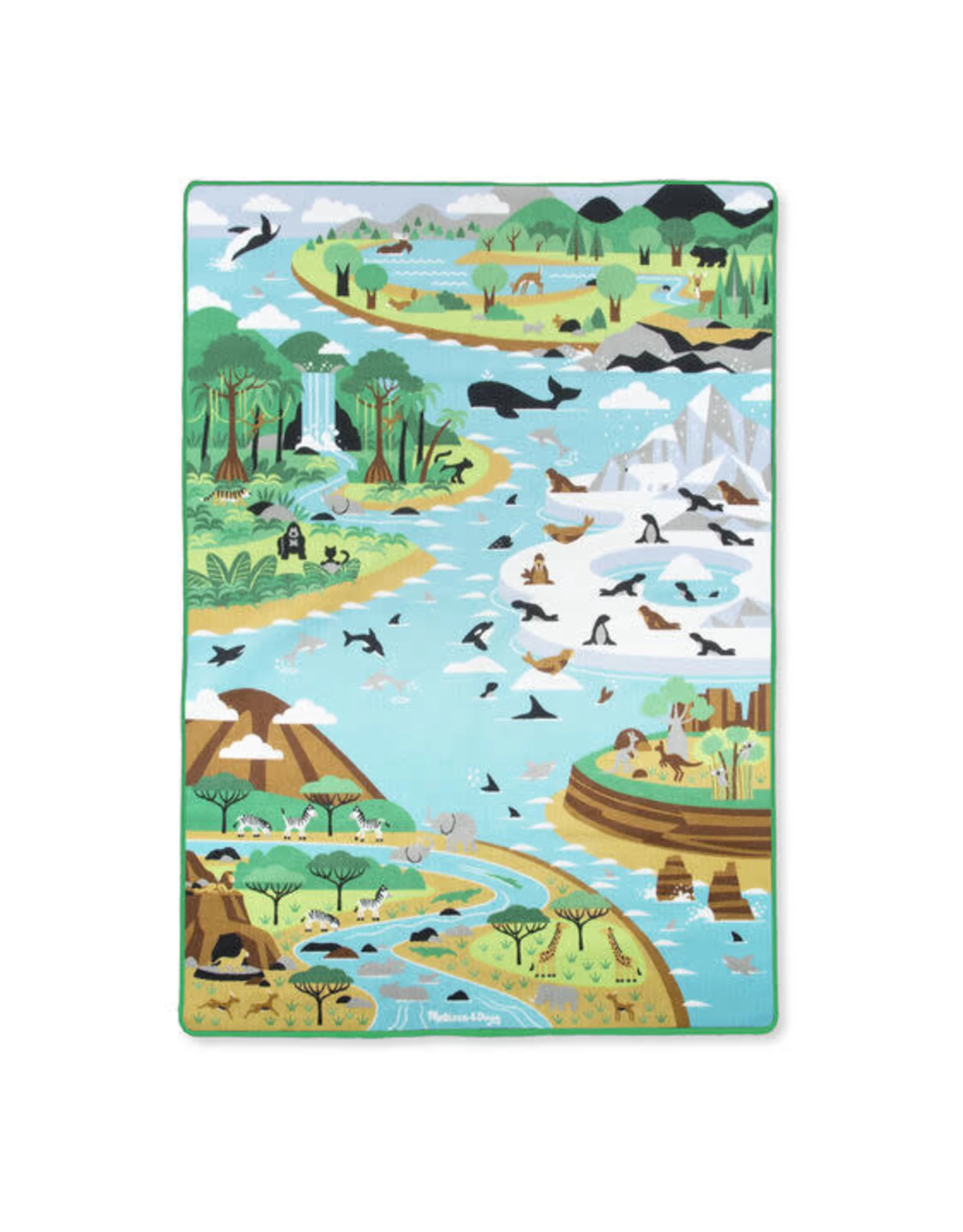 Kinderen zullen heel wat plezier beleven met dit extra grote speelkleed bij het ontdekken van de Afrikaanse Savanne, het Australische binnenland, de Noordpool , de jungle en het woud.