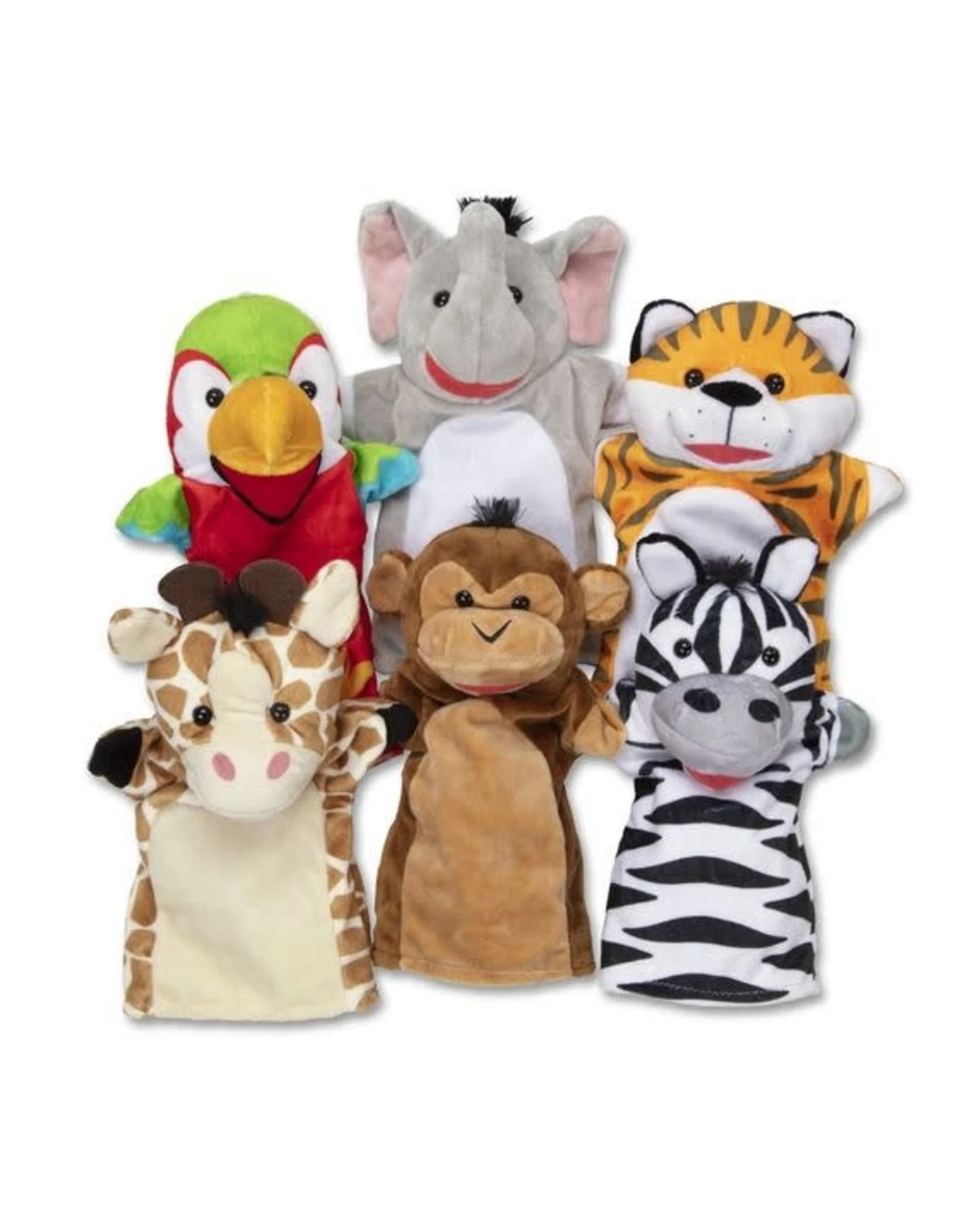 De luxe handpoppenset bestaande uit een papegaai, olifant, tijger, giraf, aap en zebra zorgt voor urenlangÂ