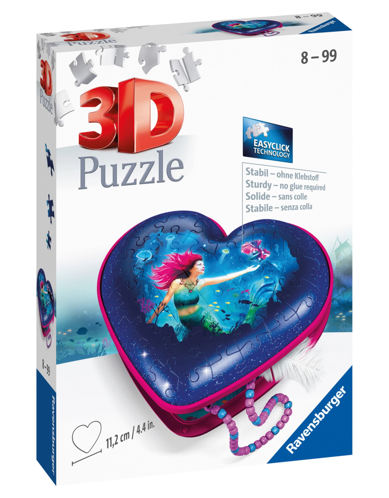Met 54 kunststof puzzelstukjes maak je een prachtig stevig hartendoosje met gaaf Enchanting Mermaids design, dat iedere meisjeskamer een coole look geeft. Gewoon puzzelen, accessoires aanbrengen en klaar is het doosje. Door het scharnier kun je het doosje heel makkelijk open en dicht doen. Perfect voor al je mooie spulletjes!