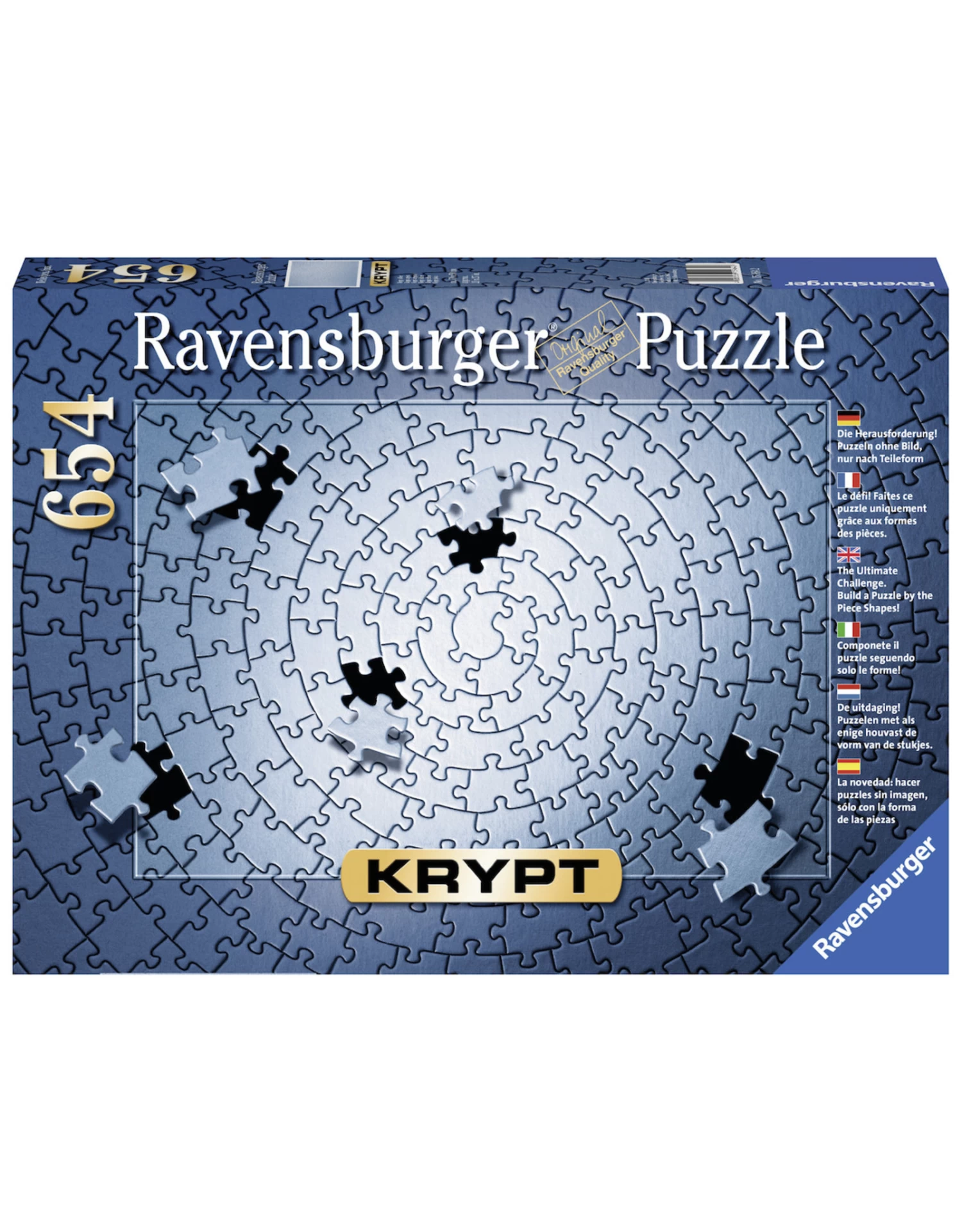 KRYPT is de ultieme uitdaging voor alle puzzelaars. Het typische kenmerk is dat er geen afbeelding is waar je aan vast kunt houden: gepuzzeld wordt alleen naar de vorm van de stukjes. KRYPT bestaat daarom uit 654 stukjes met een unieke vorm.