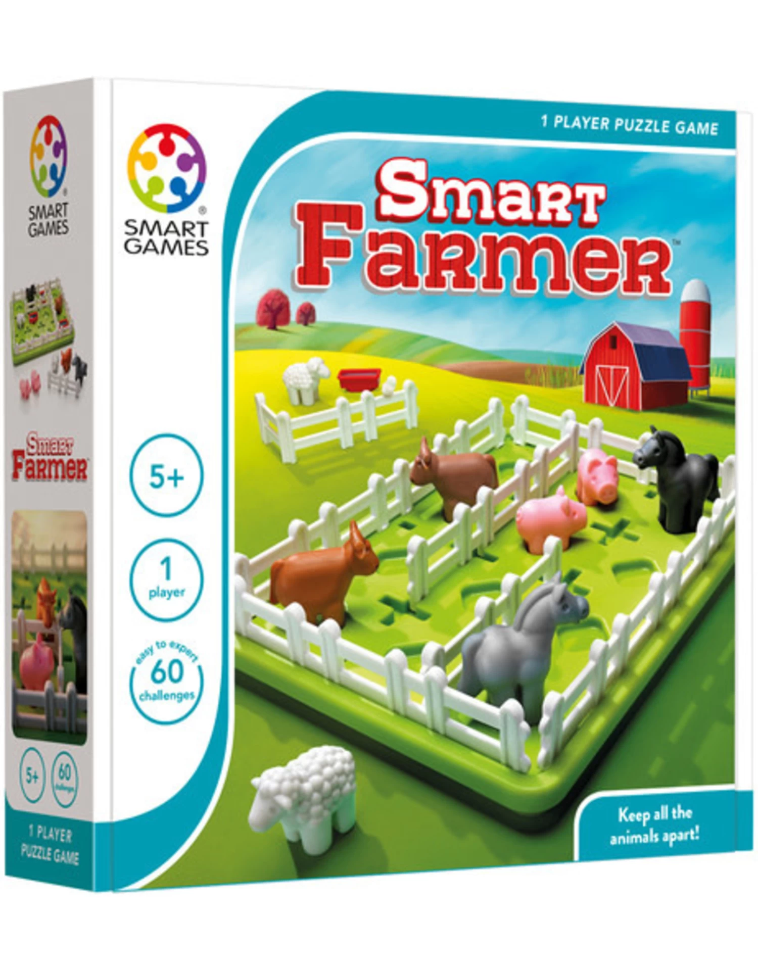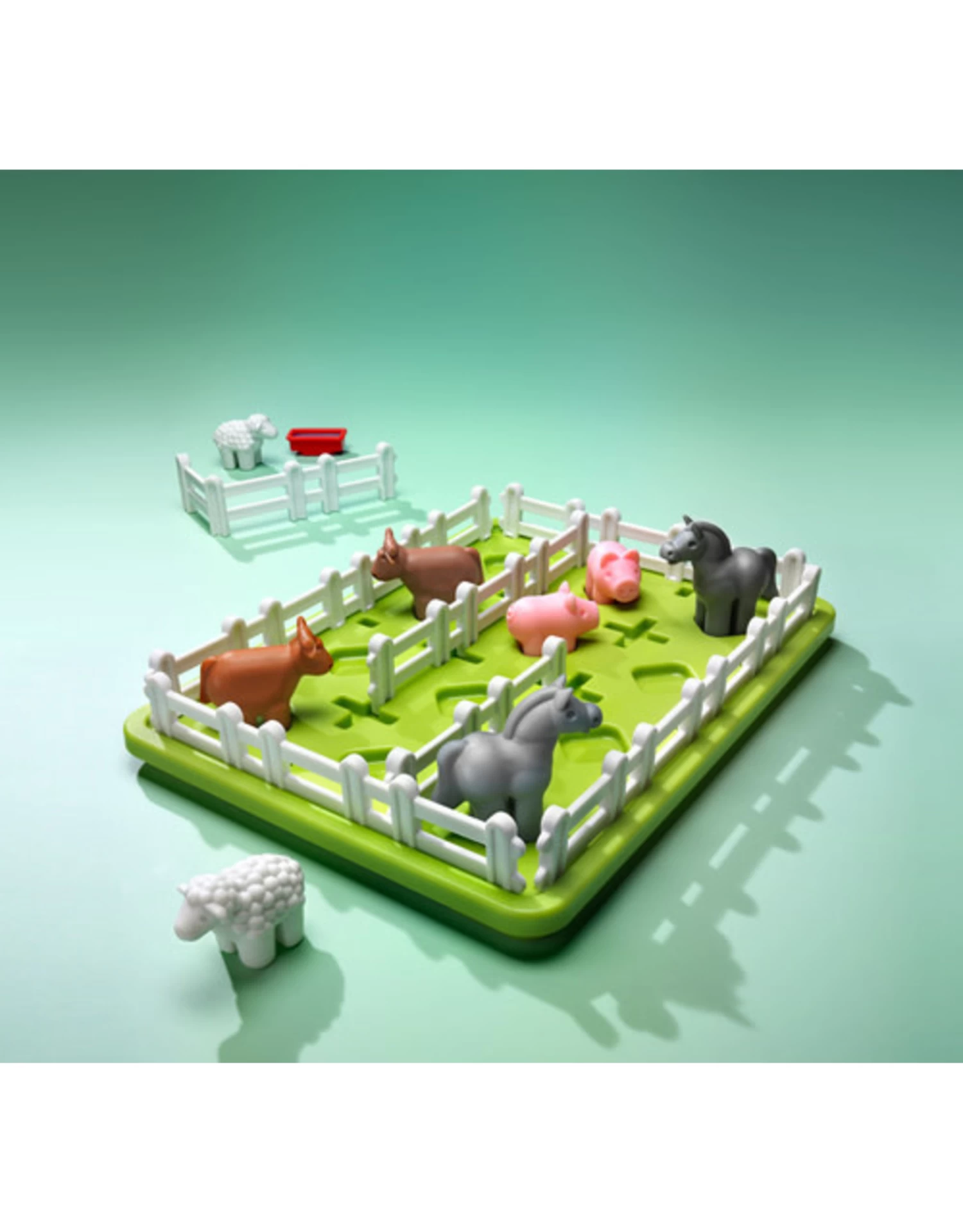 De boerderijdieren maken er bende van en moeten van elkaar gescheiden worden… maar de boer heeft maar 3 eenvoudige hekken om zijn land te verdelen in aparte weides. Kan jij hem helpen om de hekken op de juiste plaats te zetten, zodat de paarden, koeien, schapen en varkens hun eigen plek krijgen? Kan je er voor zorgen dat elk dier zijn eigen drinkbak heeft?