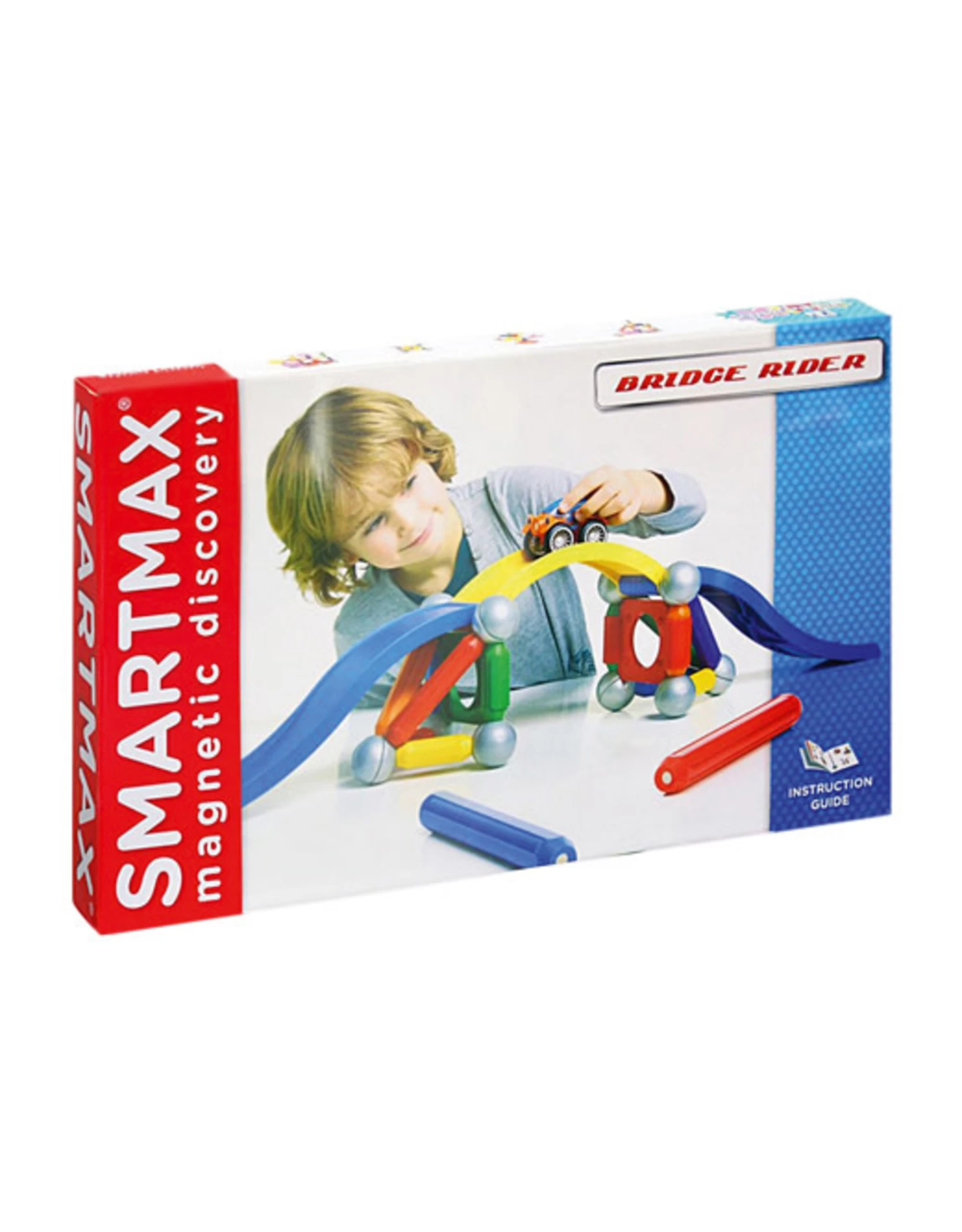 Smartmax Bridge Rider. Met deze magnetische constructieset kan je allerlei fantastische bruggen bouwen. Rijd met je auto over de brug… of eronderdoor. Bouw een reuze helling en race naar beneden. Alle onderdelen kunnen worden gecombineerd met alle bestaande SMARTMAX® sets. Samen met de staven en de metalen ballen, zorgen ze voor heel wat mogelijkheden.