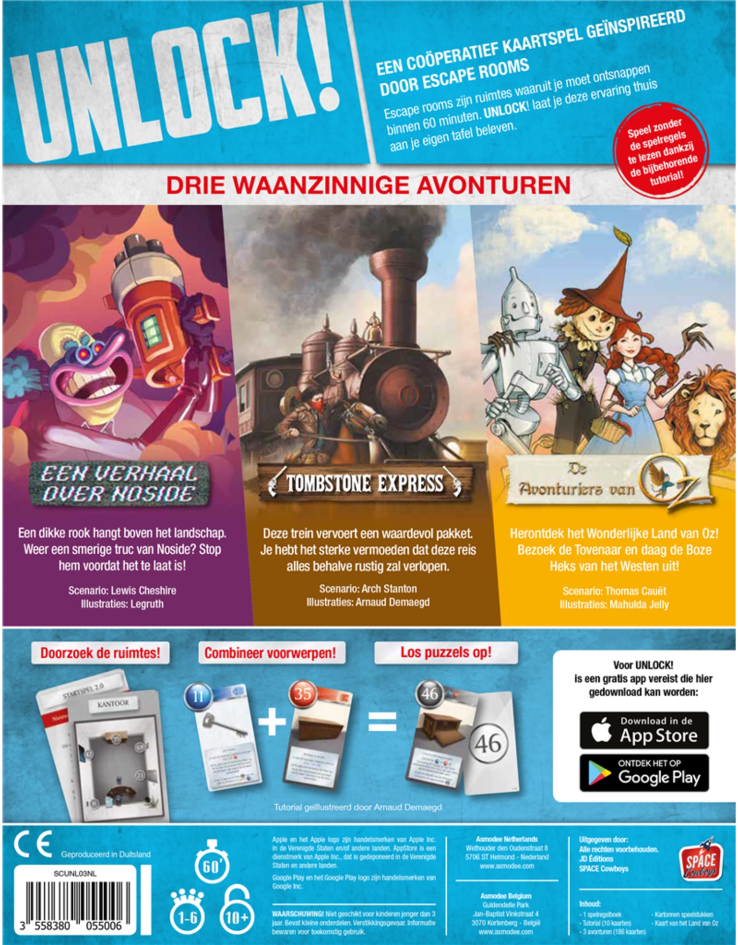 Unlock is een coöperatief kaartspel geïnspireerd door escape rooms; ruimtes waaruit je moet ontsnappen binnen 60 minuten. Unlock! laat je deze ervaring nu thuis aan je eigen tafel beleven met een kaartendeck (60/66 kaarten) en een gratis app die je door de diverse scenario’s leidt. Doorzoek de ruimtes, combineer voorwerpen en los alle puzzels op! Deze derde uitgave van de Unlock! serie bevat drie gloednieuwe, geheime avonturen: – Een verhaal over Noside: een dikke rook hangt boven het landschap. Weer een smerige truc van Noside? Stop hem voordat het te laat is! – Tombstone Express: Deze trein vervoert een waardevol pakket. Je hebt het sterke vermoeden dat deze reis alles behalve rustig zal verlopen… – De Avonturiers van OZ: Herontdek het Wonderlijke Land van Oz! Bezoek de Tovenaar en daag de Boze Heks van het Westen uit!